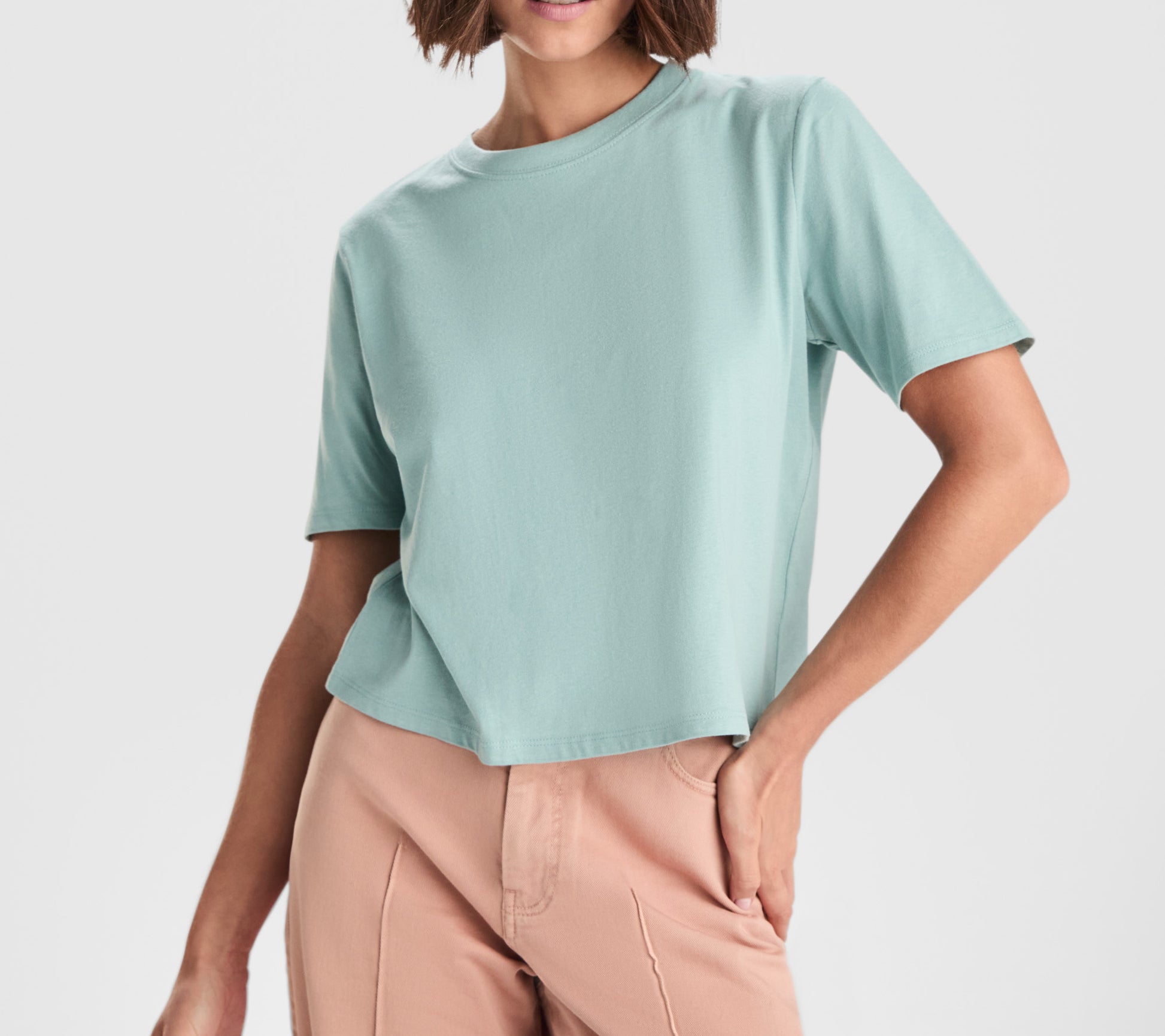 T-shirt à manches courtes avec coupe courte et ample. Col rond large côtelé 1x1. Encolure bordée de tissu assorti.